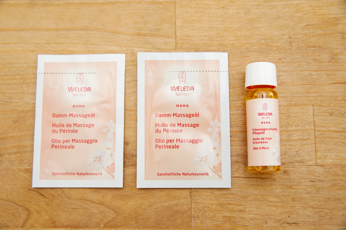 もう一つ、なんと会陰(えいいん)マッサージ用のオイルの試供品も。このオイルを使って定期的にマッサージすることで、産道の伸びを良くし、切開のリスクを減らす準備(心構え)ができるそうです。